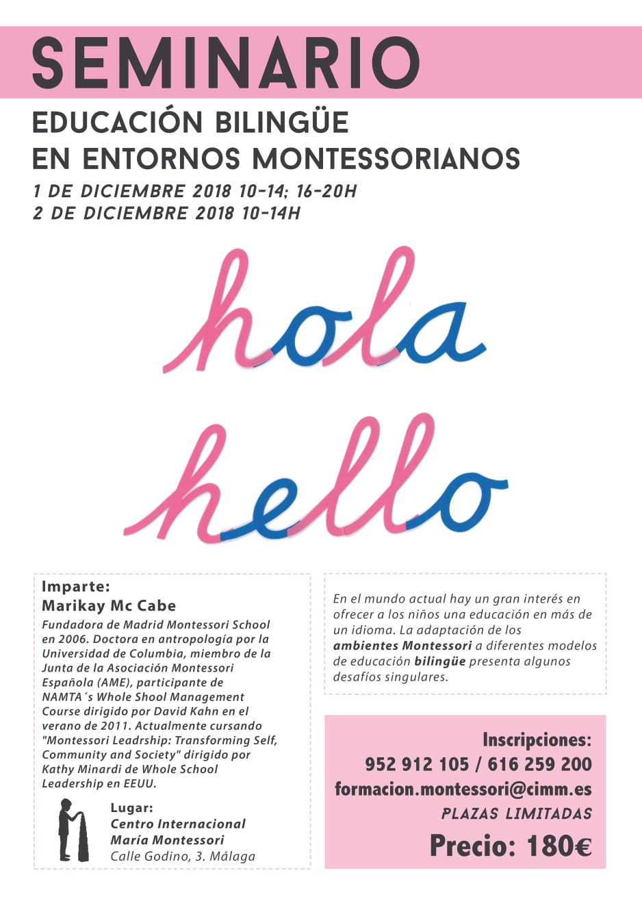 Ainda há vagas disponíveis para o workshop neste final de semana,1 e 2 de dezembro em Málaga, que se concentra na implementação do bilinguismo em ambientes Montessori.